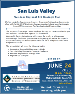 See below a link to the recording of the final presentation by Geographic Technologies Group (GTG) on the SLV Five-Year Regional GIS Strategic Plan. This comes after the completion of Stage II: GIS Needs Assessment & Feasibility Study, delivered in March 2025.